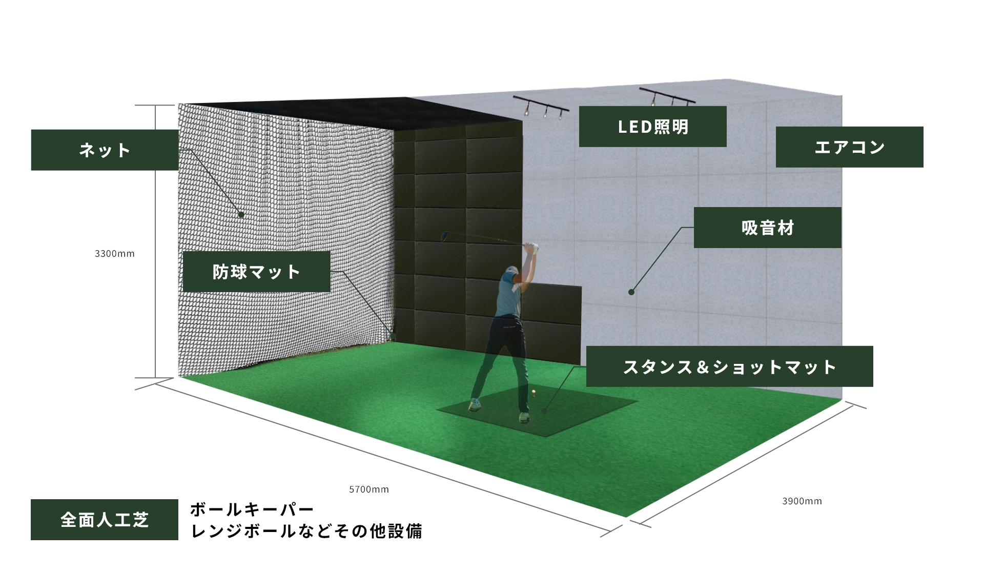 ゴルフスイングに十分なスペースのある自社開発の専用コンテナです。「吸音機能」を施した内装を、標準装備としてご提供します。